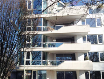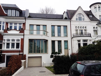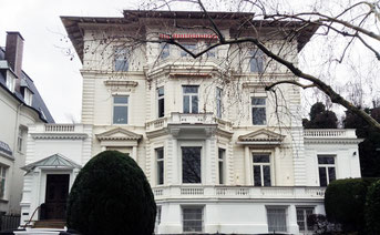 Dieses quergestellte Haus hat eine sehr wechselhafte Geschichte. 1935 wurde es gebaut. Zuvor hatte hier die Villa Kirstengestanden (siehe unten). Im Zweiten Weltkrieg brannte es aus. Alfred Kühne (Kühne & Nagel) hat es wiederaufgebaut und seither strahlte das ehemals rote Backsteinhaus in schönstem Weiß. Im November 2013 wurde es allerdings abgerissen.