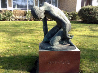 An Stelle der Villa Reimers steht das letzte Gelbklinkerhaus der Bellevue und schmückt sich mit Kunst am Bau: Eine lebensgroße Bronzestatue zeigt Achilles, der an seine Ferse fasst.